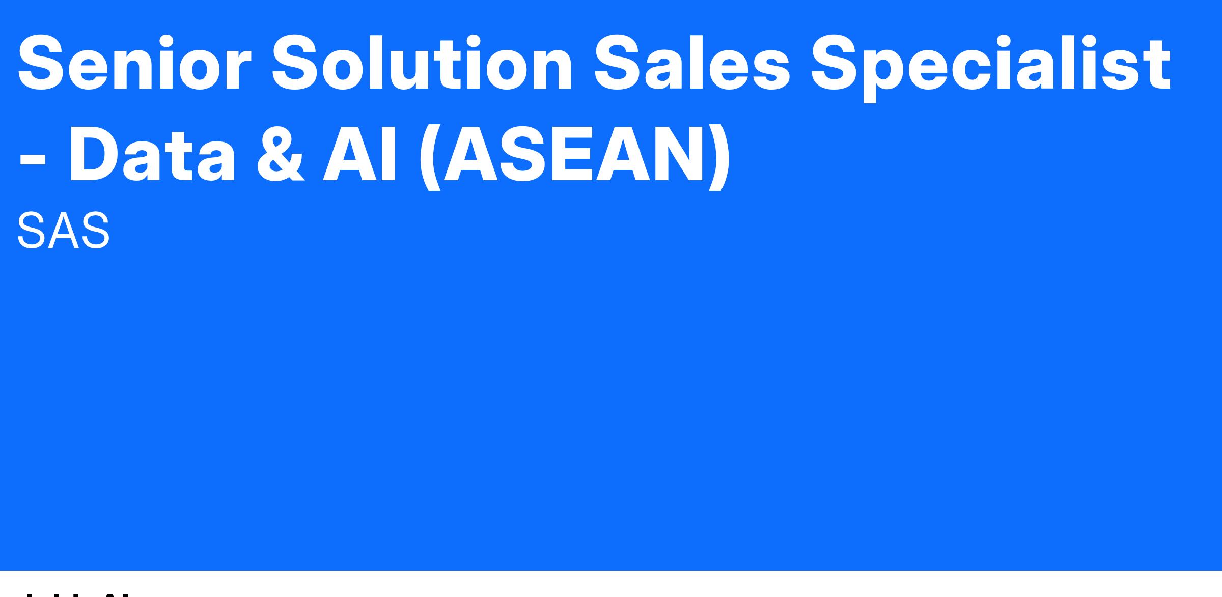 We are looking for an experienced Solutions Sales Specialist to lead on direct sales of our award-winning SAS Data & AI Solutions and services to prospective and existing customers in ASEAN. In this role, you will be working with various stakeholders, including C-level executives, to assess and implement data and AI solutions that align with their business goals. You will drive strategic discussion on AI governance, ModelOps, DataOps and the importance of trust and accountability in AI/ analytics lifecycle.